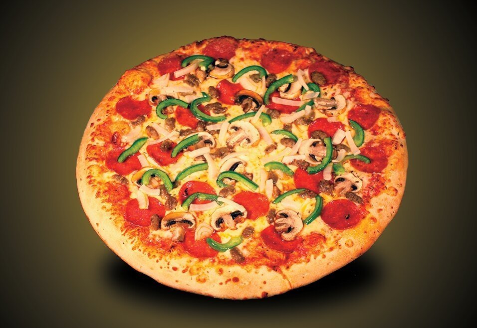 тесто, соус Мути, сыр "Моцарелла", бекон, ветчина, сервелат п/к, корнишоны, сыр "Пармезан", соус фирменный